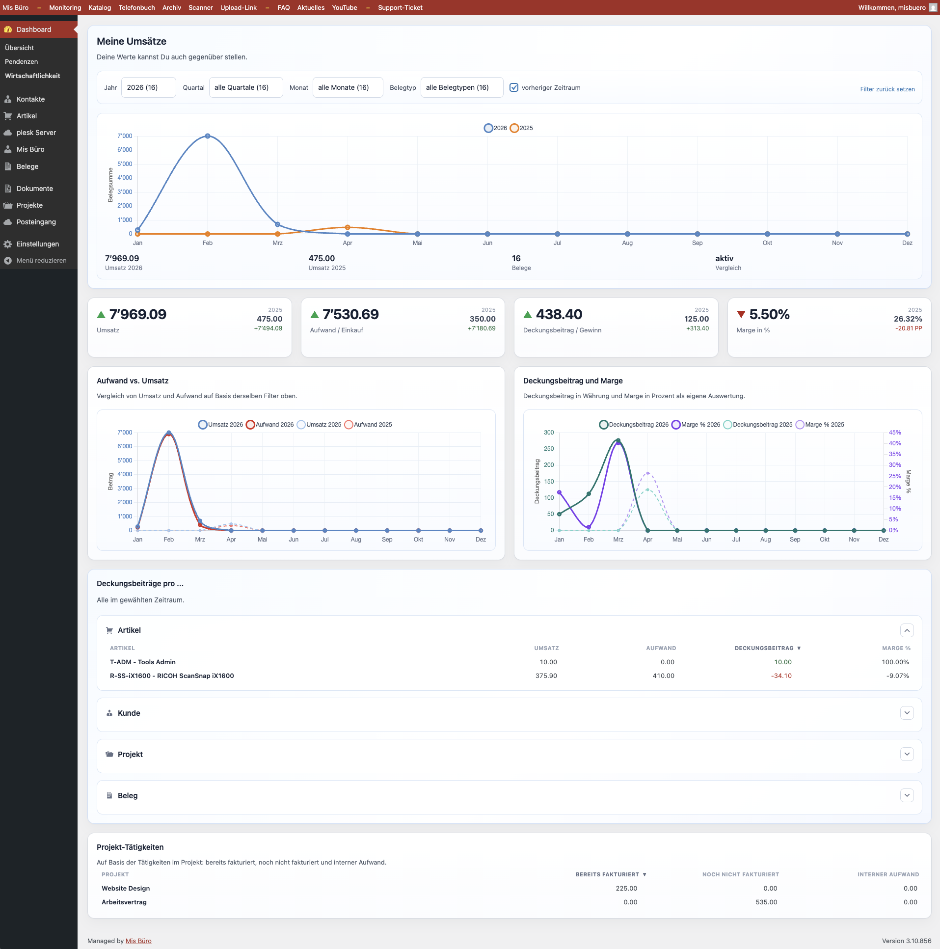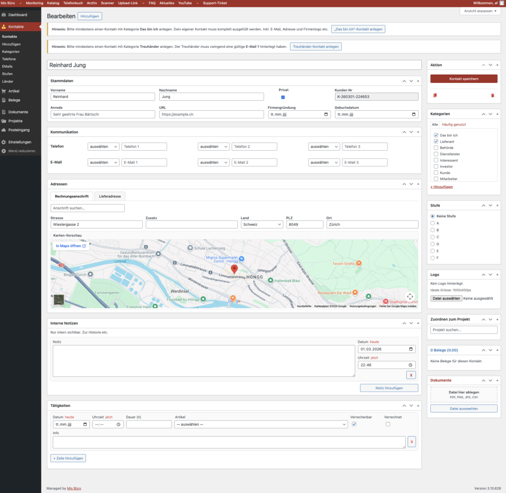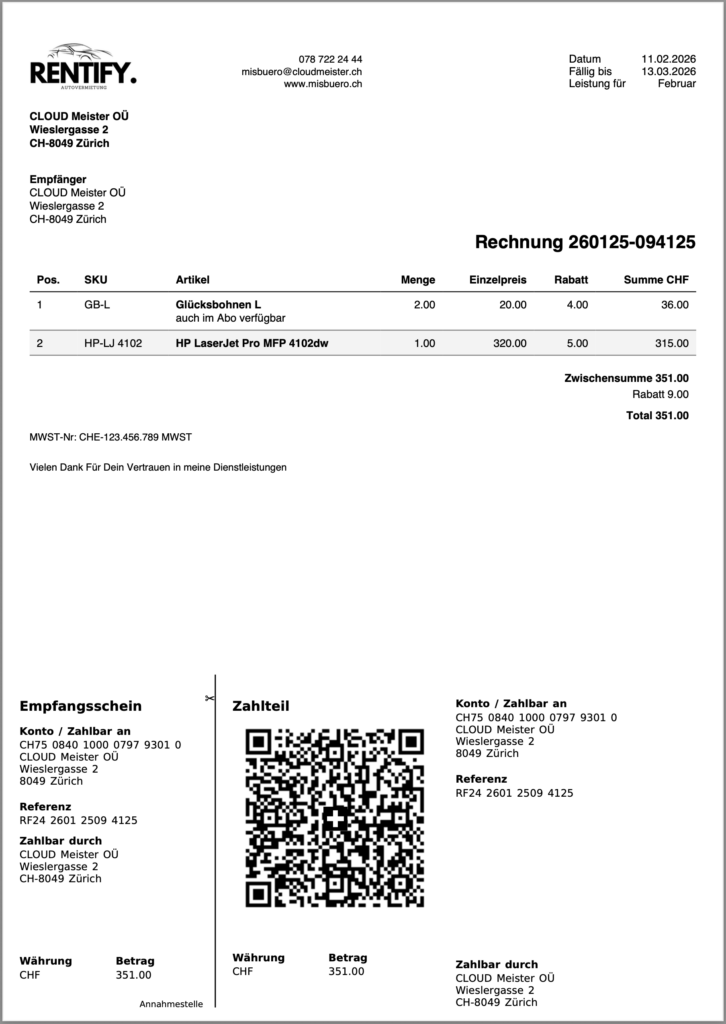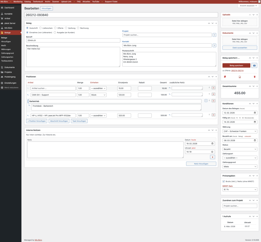 Rechnungen, Offerten, Belege und Kontakte zentral verwalten. Klar und übersichtlich.