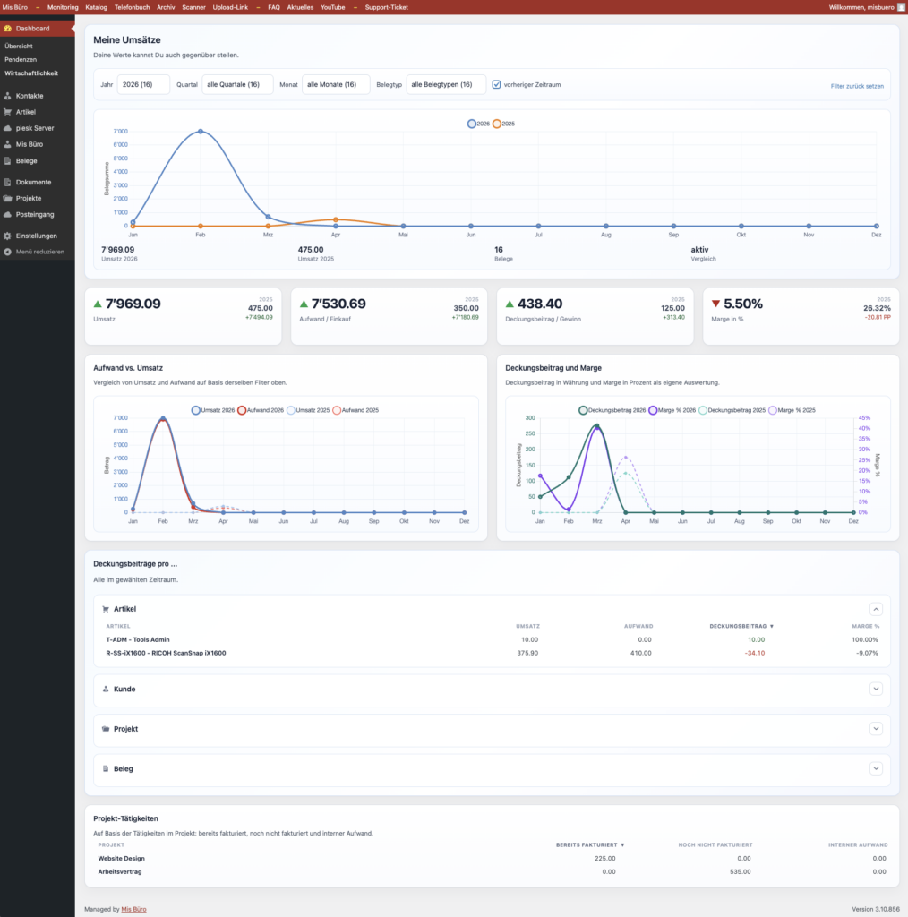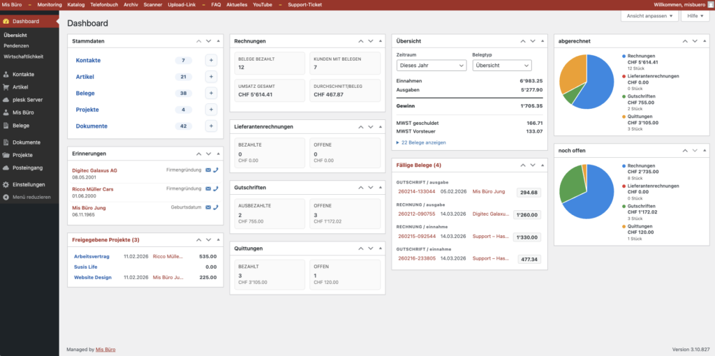 Alle relevanten Büroprozesse sind an einem Ort gebündelt: Rechnungen inkl. Schweizer QR-Code, Angebote, Lieferscheine, Beleg- und Dokumentenverwaltung, Kontakt- und Artikelverwaltung sowie ein übersichtliches Dashboard zur Zahlungs- und Statuskontrolle.